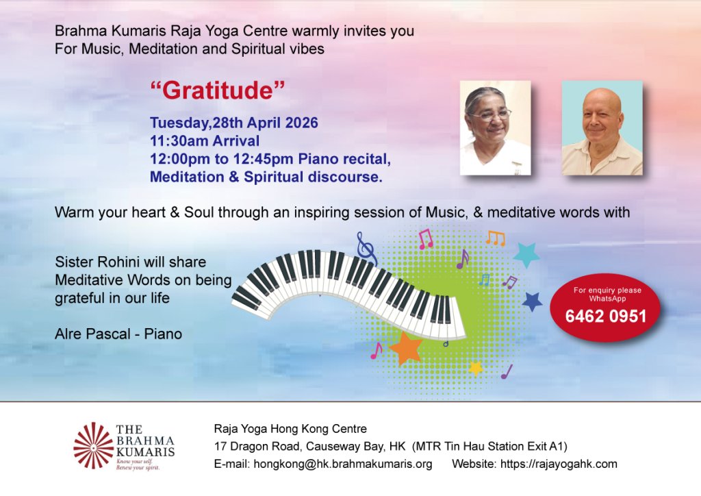 In the 21st Century, we may not have time to retreat to a place away from home or work but we can retreat inside and nourish ourselves spiritually with a meditation practice. Raja Yoga meditation means taking time, as short as 3-4 minutes, to renew your inner peace and power. It is also a time-honoured path to higher understanding, self-mastery and finding greater meaning and beauty in life.