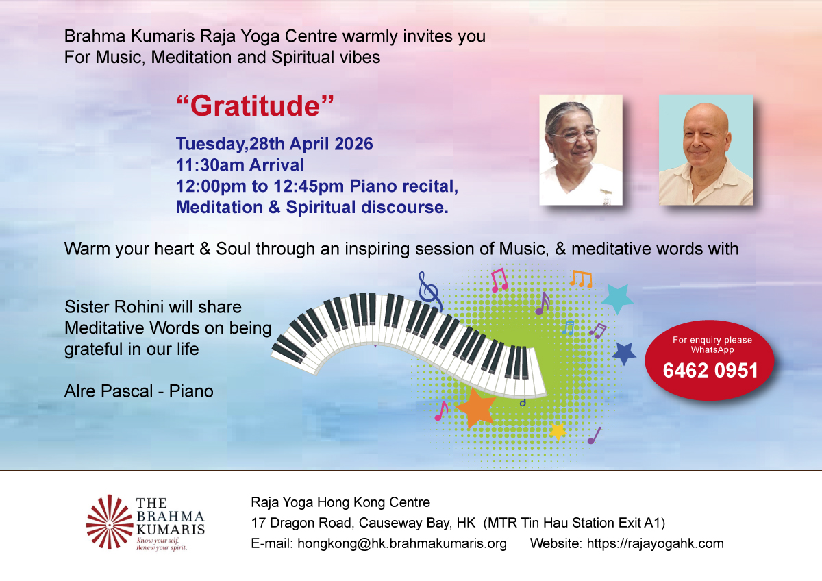 GratitudeRaja Yoga Centre, Hong Kong is inviting you to the following event. Please see flyer below for details. DateApr 28 2026 Time 11:30 am - 12:45 pm Location17 Dragon Road, Causeway Bay, Hong Kong Category Hong Kong EventsNext Event Sustenance Evening DateApr 28 2026 Time 6:30 pm - 8:15 pmShare this event