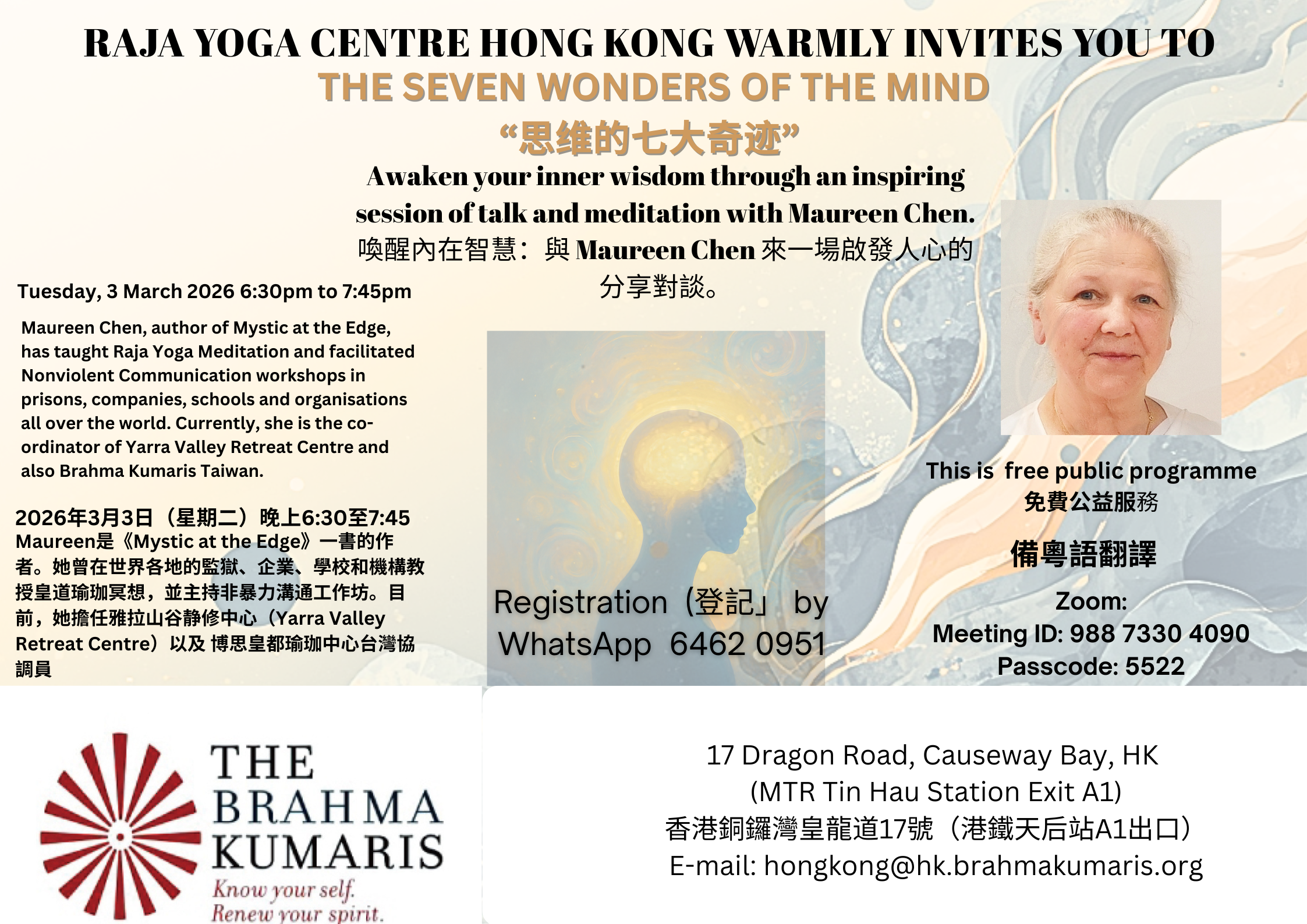 The Seven Wonders of the MindRaja Yoga Centre, Hong Kong is inviting you to the following event. Please see flyer below for details. DateMar 03 2026Expired! Time 6:30 pm - 7:45 pm Location17 Dragon Road, Causeway Bay, Hong Kong Category Hong Kong EventsNext Event Zoom Meditation in English DateApr 18 2026 Time 6:30 pm - 7:30 pmShare this event